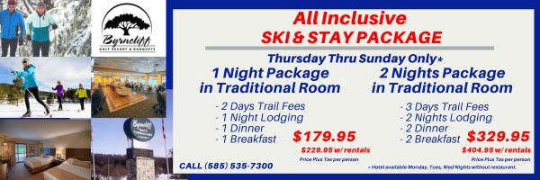 Try night skiing Friday and Saturday nights under the lights of our western trails - a unique and fun experience! Our staff looks forward to serving you at our restaurant, bar, and hotel after a day of skiing, snowshoeing, or snowmobiling. Call 585-535-7300 for more information, reservations, and current hours.